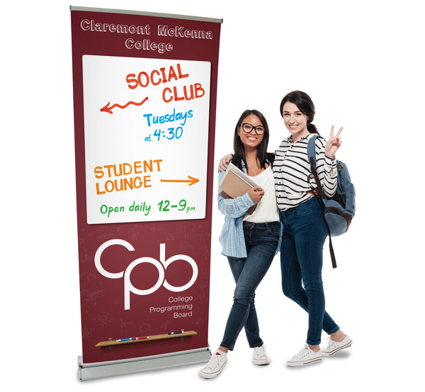 A fully customizable display turns one banner into a thousand! Endless possibilities. Print anything in permanent high-resolution CMYK ink then scribble to your heart's content with dry erase markers. Reusable again and again!